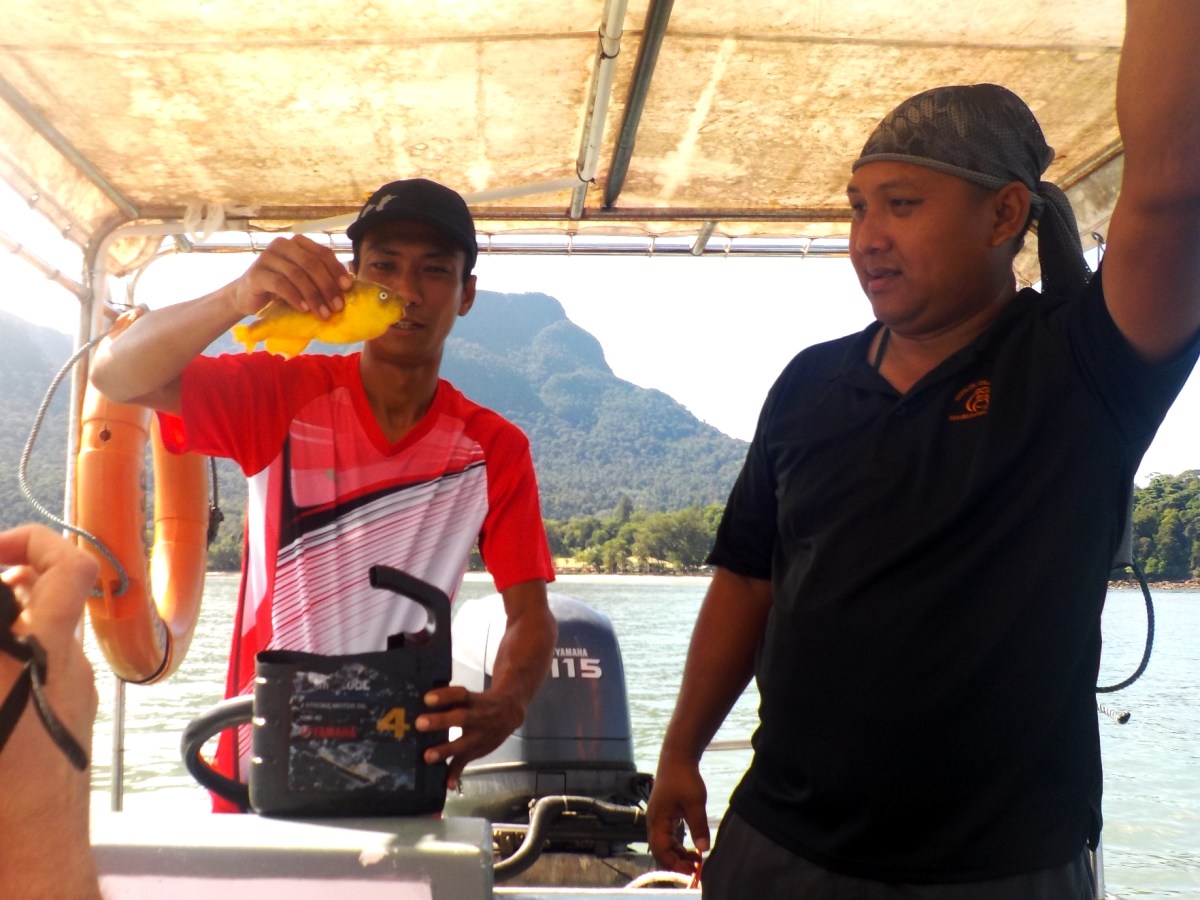 170428-008-2 Veröffentlicht 10. Juni 2017 in 1764 × 1323 in Borneo: Auf nach Satang, die Schildkröteninsel ← Vorherige Nächste → Der bisherige Fang der Fischer macht bei den Touris die Runde (li. unser Bootsführer, re. Tom, der neue Guide)