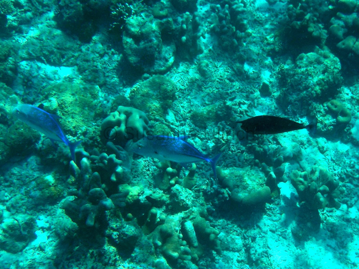 DSCN3621 Veröffentlicht 16. Juli 2018 in 1468 × 1101 in Borneo II: Sipadan – Die Insel der Träume ← Vorherige Nächste → Die blau leuchtenden Fische könnten Jackfische sein und der rechts ist ein Kurznasen-Doktorfisch